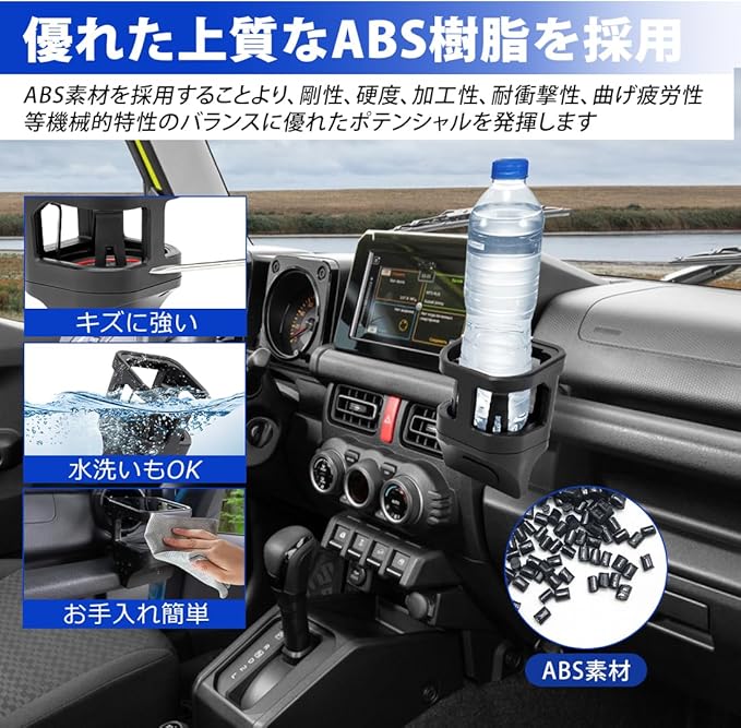 【優れた素材と高級感ある仕上げ】 ホルダー本体は耐久性に優れたABS樹脂を採用。付属のラバーマットは滑り止め&防汚加工済みで、ドリンクの結露や汚れ対策も万全です。インテリアに自然に溶け込むデザインで、見た目も機能もこだわりたい方におすすめのジムニー内装パーツです。