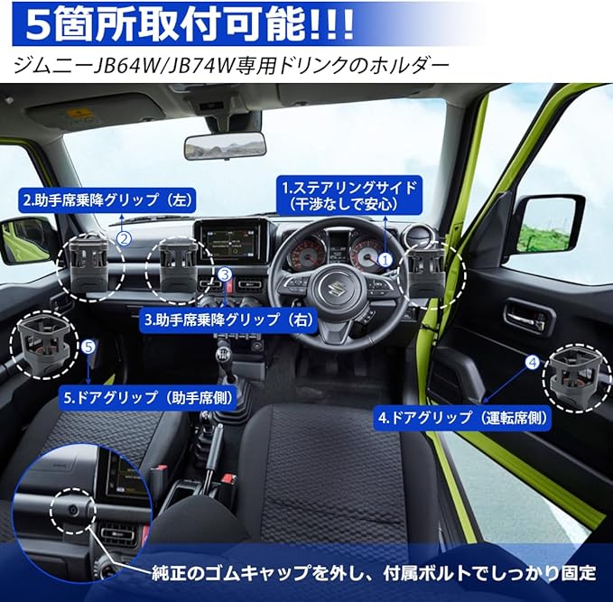【2021年最新型&ジムニー専用設計】▼適合車種:スズキ ジムニー JB64W型・ジムニーシエラ JB74W型 。▼年式:2018年7月~(平成30年7月-現行)▼セット内容:増設ドリンクホルダーx1PCS、ゴムマット 1、穴隠しカバー、ボルト 1、ワッシャ 1、六角レンチ 1▼効果抜群な2021年最新型カップホルダーです。製作に当たり実車にて幾度もフィッティング確認を行い仕上げたスズキ ジムニー専用設計モデルになっております。