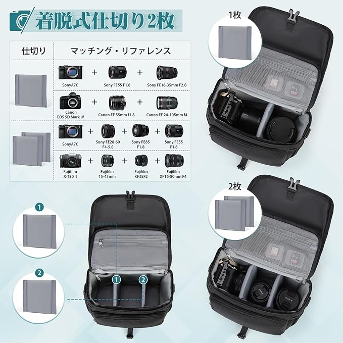 【防護性】優れた保護性能&耐久性本カメラバッグの仕切りの厚さが10mmぐらいで、カメラやアクセサリを不意の衝撃や傷から保護できます。※ただし、機器の完全保護を保証するものではございませんので、強度の落下などには十分にご注意ください。