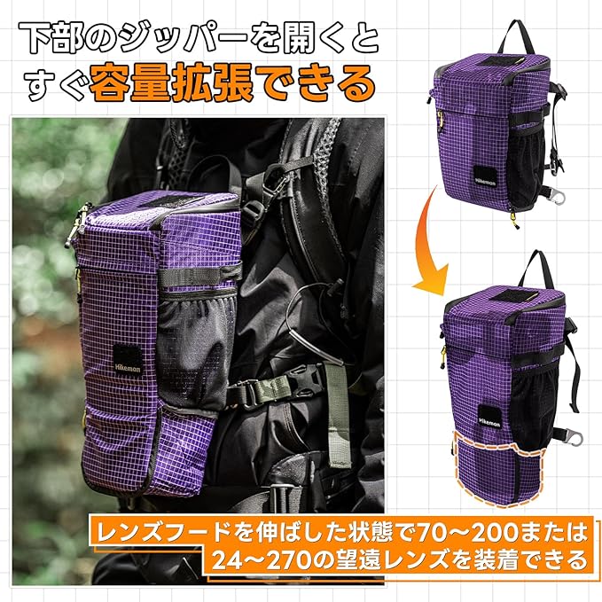 「容量拡張可&仕切り板付き」:下部のジッパーを開くとすぐ容量拡張できます。レンズフードを伸ばした状態で70~200または24~270の望遠レンズを装着できる。位置調整可能な仕切り用板も付きで広角レンズと望遠レンズを分けて収納することもできる登山用カメラバッグです。