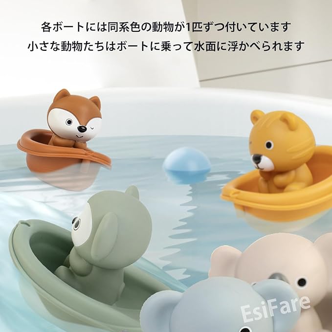 【製品の詳細】セット内容:お風呂おもちゃ動物(象+サル+狐)3個と船3個 素材:柔らかいプラスチック。 防水・防湿素材なので、長時間水に浸しても変形や色褪せしません。