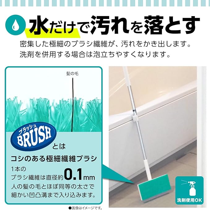 ●水だけで汚れをブラッシングできるブラシ・浴室壁の水滴を除去するスクレーパー・天井掃除用ウェットシート取り付けの3WAY機能