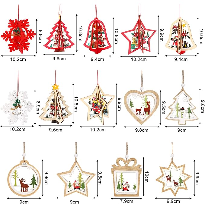 14個セット クリスマスツリー オーナメント 木製 クリスマスツリー 飾り 北欧 デコレーション 立体 透かし彫り 星 雪 サンタ 雪だるま ハート ベル