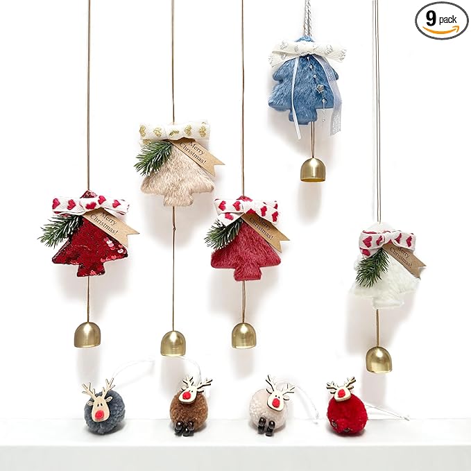 クリスマスベル チャーム クリスマスツリー オーナメント 9 個セット - クリスマスデコレーション 布製モコモコクリスマスツリーベル 鈴 クリスマスツリー 飾り,クリスマス 装飾ベル ぬいぐるみ 手作り感 北欧風 壁掛け、玄関飾り、窓飾り、プレゼント添え,新年の贈り物