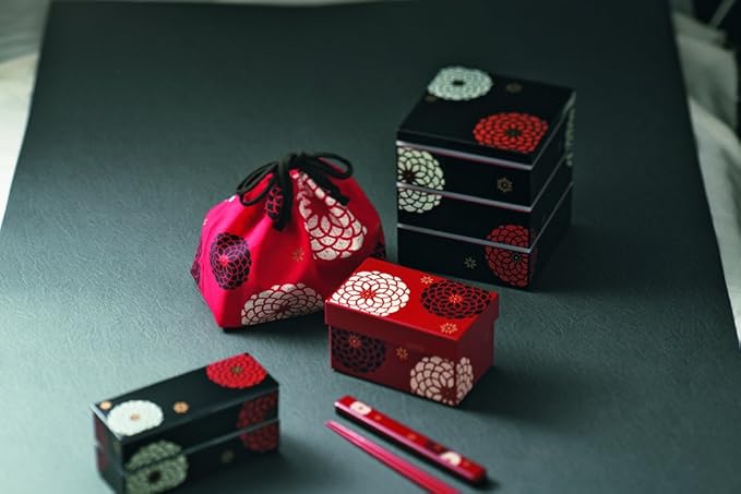 黒・赤をベースに配色したシンプルでモダン、大きな花の模様が美しい華やかなお重箱です。