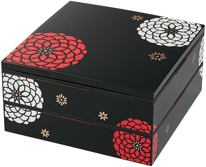 黒・赤をベースに配色したシンプルでモダン、大きな花の模様が美しい華やかなお重箱です。