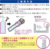 【ご使用方法】1. 毛ゴミフィルターの凸部分を異物フィルターの取っ手側に装着して下さい。2. 端から約5mm下げた位置でセットします。頻繁にお掃除サインが点灯される場合は、水流の流れを良くするため、約10mm下げた位置にセットして下さい。