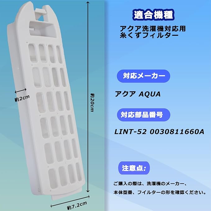 注意事項:この製品はaqua用糸くずフィルターであり、純正品ではありませんが、同様に使用することができます。また、ご注文の際は、上記の対応型番と、お使いの洗濯機の機種、糸くずフィルターの形状や大きさをご確認の上、ご購入ください