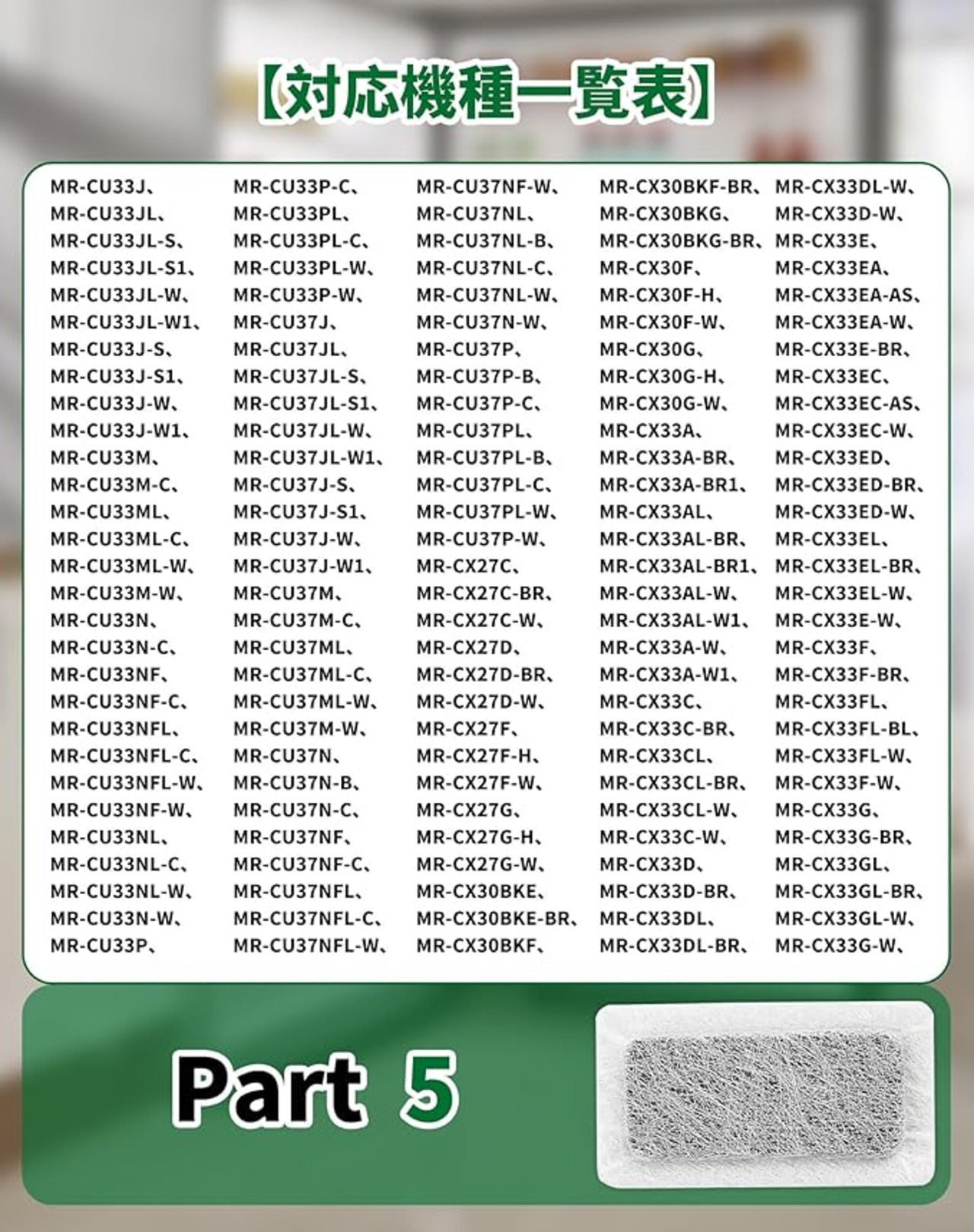 【対応機種】MR-C33F、MR-C33F-W、MR-C33G、MR-C33G-W、MR-C34A、MR-C34A-P、MR-C34A-W、MR-C34C、MR-CL38N-T、MR-CL38N-W、MR-CL38P、MR-CL38PL、MR-CL38PL-S、MR-CL38PL-T、MR-CL38P-S、MR-CL38P-T、MR-CM38N、MR-CM38NF、MR-CM38N-F、MR-TJ38NL、MR-TJ38NL-T、MR-TJ38N-T、MR-TK40R、MR-TK40R-P、MR-TK40R-Sに対応できる三菱用冷蔵庫製氷機フィルターです。(ほとんどの三菱冷蔵庫製氷機に対応できすが、具体的な機種は写真と商品の説明を参考至てください。)