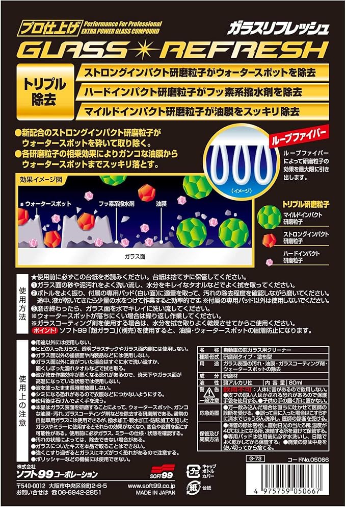 ●新開発のトリプル研磨粒子が、これまでのガラス用コンパウンドでは落とせなかったウロコ状のシミを強力に除去します。●ガラス表面の汚れ・油膜・ガラスコーティング剤・ウォータースポットの除去。
