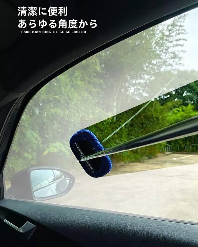 車窓拭き すべてのコーナーに届く:調整長さ1mのロング設計:手が届きにくいフロントガラスの奥や大型車の内窓も、らくらく車内清掃。薄型ヘッドで傾斜のある窓にもしっかりフィット。車の窓拭きストレスから解放され、隅々までクリアな視界を確保できます。