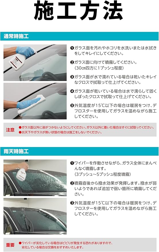 施工方法: 雨天時:ワイパーを作動させながら、ガラス全体にまんべんなく噴霧します。噴霧直後から撥水効果を発揮します。撥水が弱いようであれば追加で弱い箇所に噴霧してください。 晴天時:ガラス面の汚れやホコリを拭き取り、ガラス面に向けて噴霧して下さい。クロスで拭取って施工完了です。