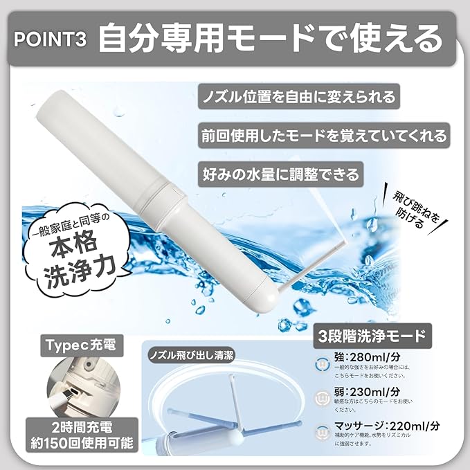 【好みの水量に調整可能】 3段階洗浄モードと記憶機能搭載で、前回使用したモードを覚え、好みの水量や水圧を簡単に調整。自分モードで「気持ちいい」を実現し、痛みのない洗浄体験を提供する携帯洗浄器です。