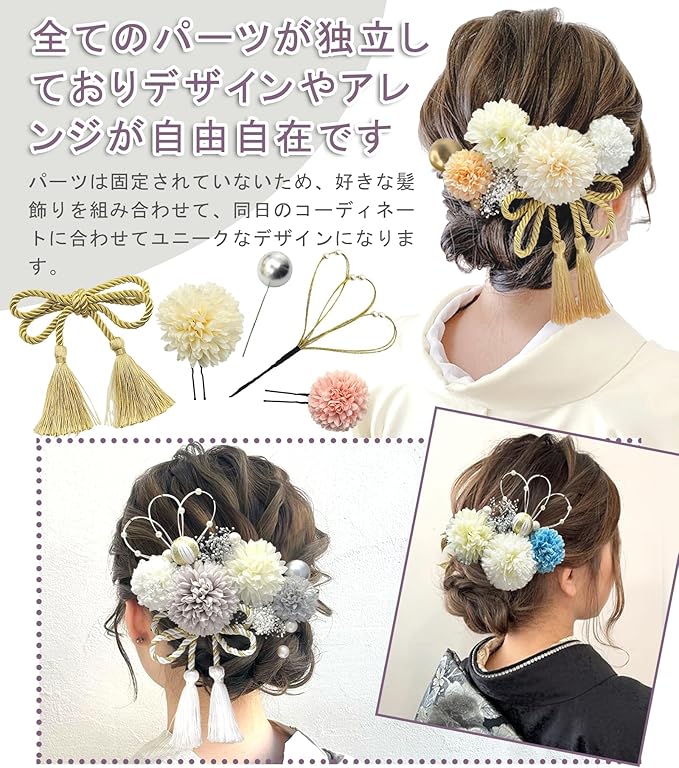 [JZOON] 成人式 髪飾り【12色展開】 ピンポンマム 紐 ドライフラワー 七五三 浴衣 袴 着物 飾り 振袖 和装 卒業式 結婚式 水引 かすみ草 造花 手作りかわいい 白 F3710