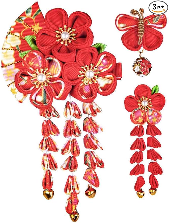 [JZOON] 髪飾り3点セット 成人式 七五三 浴衣 袴 着物 振袖 和装 つまみ細工 花 卒業式 結婚式 鈴付き 手作り 赤 青 紫 ピンク 白 5色全15選