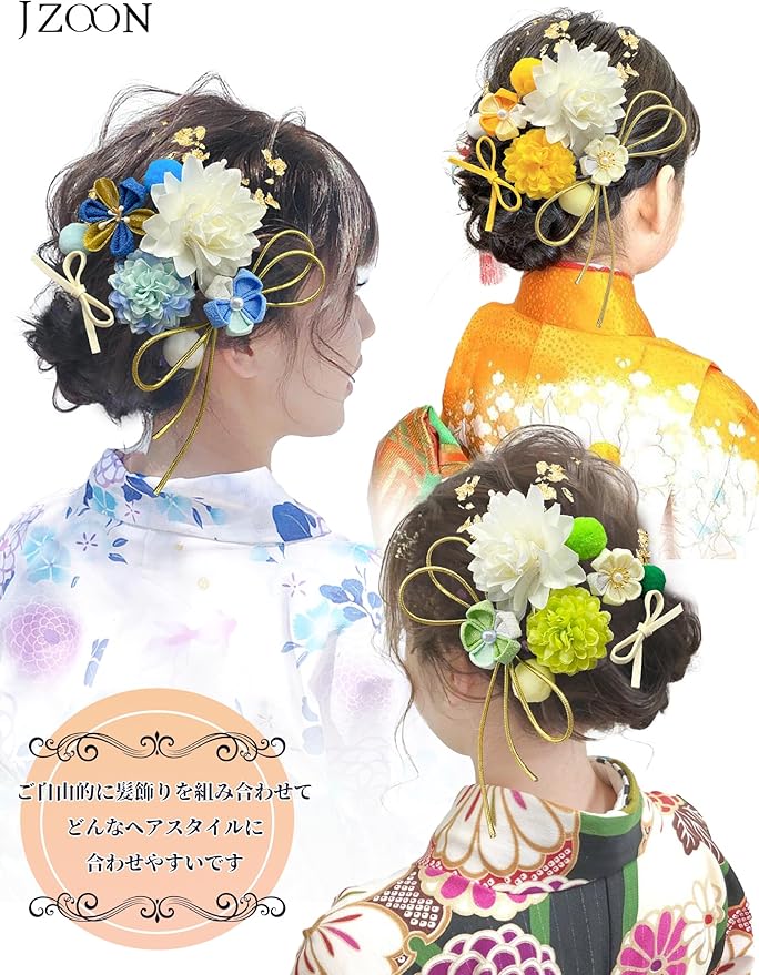 [JZOON] 成人式 髪飾り ヘアアクセサリー つまみ細工 菊 ピンポンマム クチナシ ポンポン 金箔 リボン 可愛い 手作り 浴衣 袴 着物 振袖 和装 成人式 前撮り 七五三 花火大会 イベント 卒園式 卒業式 結婚式 9色 11点セット F2010