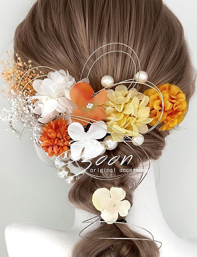 [JZOON] 成人式 髪飾り 【7色展開】 ドライフラワー あじさい か すみ草 造花飾り ヘアアクセサリー 水引 ヘッドパーツ 振袖 着物 卒業式 七五三 浴衣 袴 結婚式用 手作り パール 専用ケース付き オレンジ Y3013