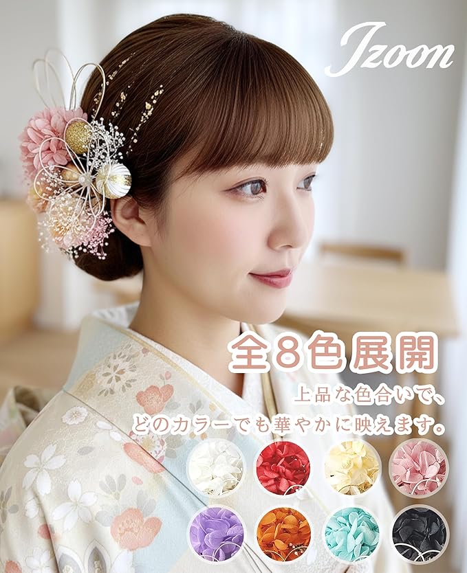 【ユニークなデザイン】繊細なアートフラワーと伝統的な水引が織りなす髪飾りです。上品で洗練された色合わせが、どのカラーを選んでも華やかな印象を演出しています。優しい色合いと繊細な質感のは魅力的な特徴です。職人が心を込めて手作業で作り上げた逸品です。
