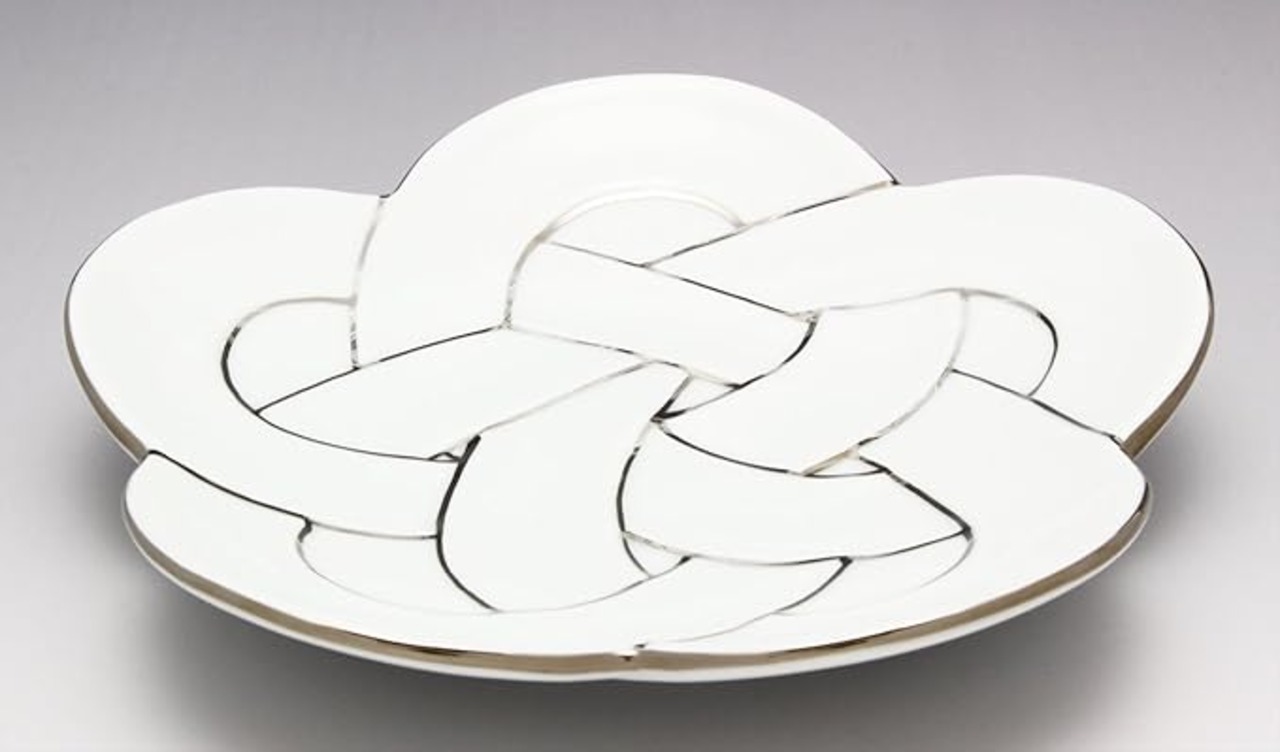 有田焼は佐賀県有田町を中心に焼かれる陶磁器のこと。400年の歴史をもつ。<>有田の磁器は17世紀後半から18世紀後半にかけて、国内はもとよりヨーロッパを主とした海外へも多く出荷されるようになった。<>硬く丈夫で、透明感のある白磁に、藍色や赤・黄・金など鮮やかな色が繊細にほどこされているのが特徴。<>縁起のいい「結び」のデザイン。<>普段使いはもちろん、お祝いの席にも最適。