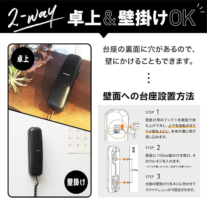 【安心の日本語説明書付き】この固定電話機は、日本語の説明書付きで初めての方でも安心。受話器の裏にテンキーが装備されて、着信音の調整も3段階で可能。電源不要で、壁掛けや卓上にも対応しているため、家庭用でもビジネス用でも柔軟に使えます。シンプルフォンで、リダイヤル機能が付いた、安くて使いやすい電話機です。オフィスや家庭での電話器としても高評価です