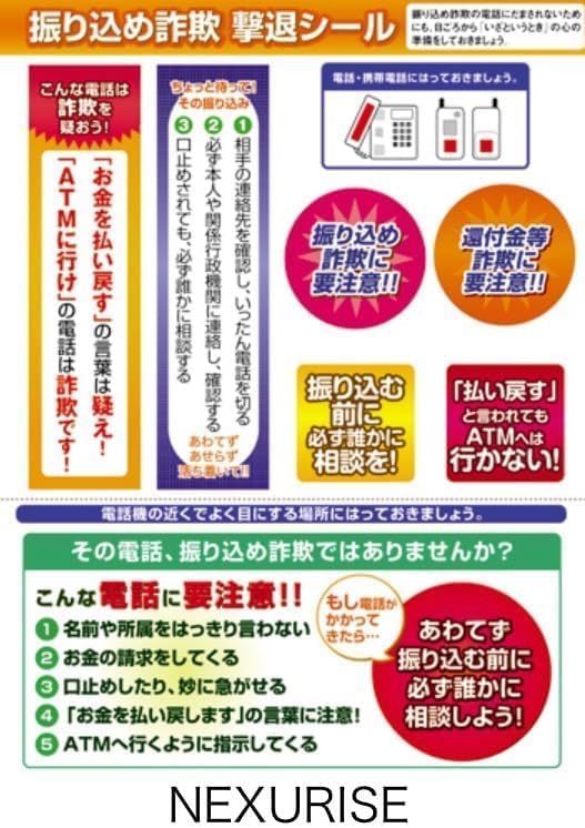 ✅振り込め詐欺撃退シールが付属しておりますので、電話機や電話機の周囲に貼って詐欺被害防止にお役立てください。(B5サイズ台紙に7種類の注意喚起のシールがカットされております)