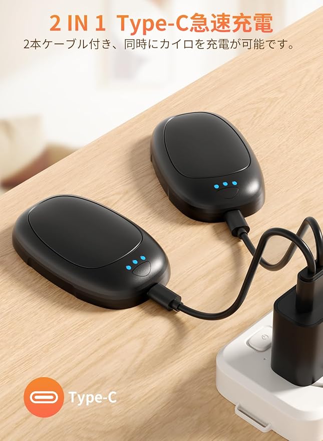 「2本充電ケーブル」また、電気かいろは2本USB-C充電ケーブル付き、カイロを同時に充電するもでき、充電時間を1本しかない他社と比べて半分短縮、わずか4-5時間で二つとも満電状態になる。