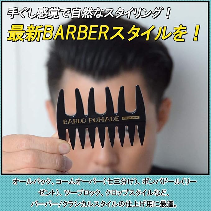 MADE IN JAPANのポマード限定商品“BABLO POMADE(バブロポマード)”のオリジナルコームとメッシュコームのセットアイテム。ポマードでのスタイリングのお供として使えるようクラシカルなデザインに仕上げました。歯の間隔が異なる2種類のコームでお好みのバーバースタイルを。