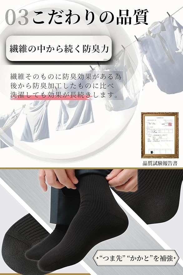 【薬剤を使わず抗菌防臭】海藻由来のアルギン酸を繊維内部に結合することで薬剤による防臭加工を一切せずに半永久的に抗菌防臭効果を発揮。安心して履けるメンズ靴下。