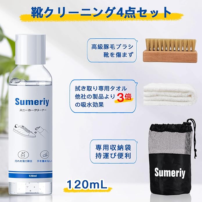 【セット内容】120mLスニーカークリーナー、靴を傷まない高級豚毛ブラシ、高密度繊維専用拭き取りタオル、繰返し使用可能専用収納袋。