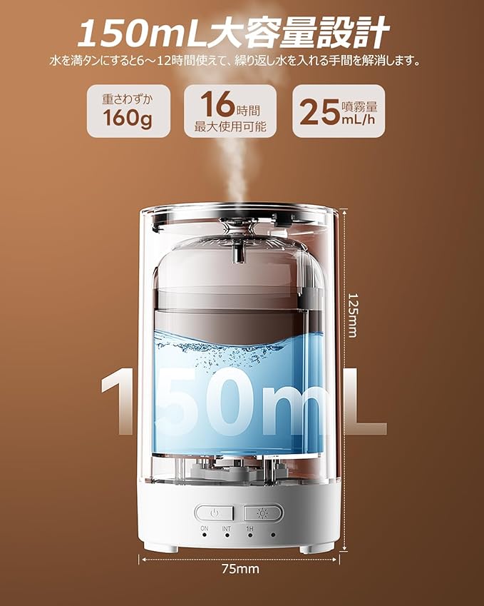 【2種類スチームモード・ 省エネ】高効率保湿で快適空間】2種類の加湿モードが調節できるため、部屋の湿度状況、ご使用の場面に応じての調整が可能です。ミスト量は25ml/h! 独自の超音波霧化技術を採用し、水分を微細な霧にして空気中に広がりやすく、部屋全体をしっかり保湿し、乾燥から守って快適な空間を作り出します。タンク容量は150mで、1回の給水で朝までお使いいただけます。運転中もタンクを外したりすることなく、タンク内の水がなくなると自動的に停止します。そのため、お出かけ中、就寝時などの長時間の使用でも空焚きをしてしまう心配がなく安心して使えます。消費電力の少ない超音波式でパワフル加湿と省エネを実現しています。
