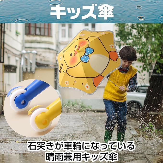 【便利な滑輪付きで移動も簡単】 傘の持ち手部分には小さな車輪(滑輪)が搭載されており、地面を転がして簡単に移動できます。お子様が楽しく使えるだけでなく、荷物が多い日でも手軽に運べて便利です。遊び心あるデザインで、持ち運びが一段と楽しくなります。