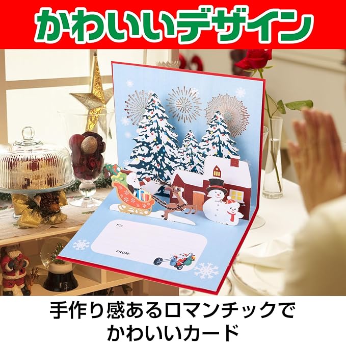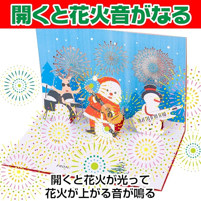 【光と音で楽しむクリスマス】 カードを開くと、幻想的なライトと花火のような音が広がる特別な仕掛け付き。光と音が組み合わさることで、クリスマスの夜をより華やかに演出します。立体的なデザインとイルミネーション効果で、ギフトとしての特別感が一層高まります。