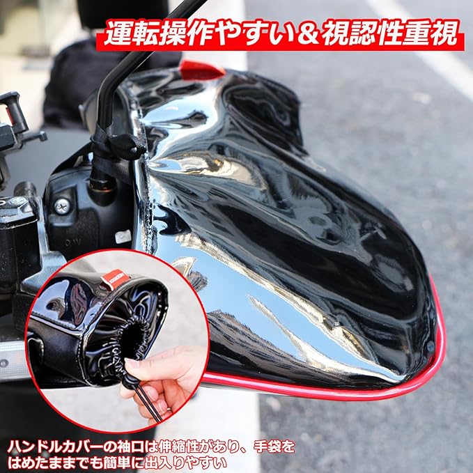 ✺【操作性良い・保温防風】:カバーのインナーでスロットル操作を行いながら鍋掴みのような要領で、ブレーキやクラッチを外側の紐に固定して操作します。また、操作部の親指を透明にし、操作ボタンを見やすくなります。風圧抵抗で型崩れしにくく、グリップも効いていて操作感もよい。防水性と防寒性を増すような設計で作られており、通勤や通学などのデイリーユーズにぴったりです。