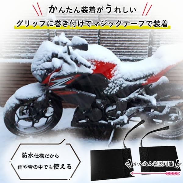 【商品説明】 ・指先の冷え対策におすすめなグリップヒーターです。 ・高温:赤色(約70℃)、中温:緑(約60℃)、低温:青色(約50℃)の3段階で温度調整をすることができます。 ・防水仕様なので雨や雪の中でも使用することができます。 ・マジックテープ式で簡単に着脱可能です。 ・USB給電式です。 【商品仕様】 カラー ブラック 素材 ケブラー耐摩耗布