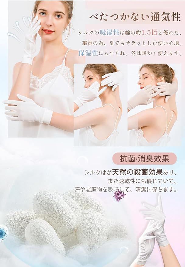 【素材】本体:シルク 100% 、手首:シルク95%,スパンデックス5%(手首のゴム) シルクは肌に近い天然成分で、熱伝導率 が低い上に吸湿性に優れていて、 保温性にも優れた繊維で、「冬 は暖かく、夏は涼しい」 優しい着け心地で一年中快適にご愛用頂けます。