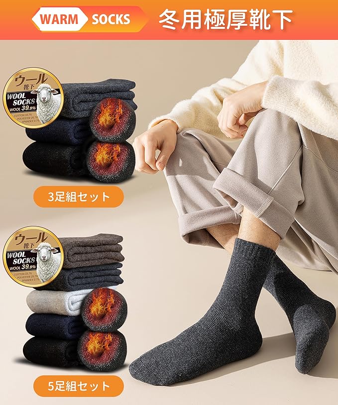 【冬用零下防寒靴下登場!】サイズ:約25㎝~29㎝、重量:約73.5g。適用季節は秋、冬、春です。日本人の足型の長さによって改良されており、伝統的な靴下の長さを超えました、ファッションと防寒の二重スタイルを実現されました。高品質のメンズウールンソックスは、上質なウール(39.9%)とコットン(33.7%)の混紡素材で作られ、保温性と耐久性の完璧なバランスを実現しています。ウール混紡素材は優れた保湿性、吸放湿性、そして暖かさを持ち、体温を維持しつつ蒸れにくい快適な履き心地を提供します。一般的な45gの冬用ソックスと比べて、当社の靴下は厚みがあり、暖かく、通気性と耐摩耗性に優れ、最大74gの重さで零下の環境でも足を暖かく保ちます。