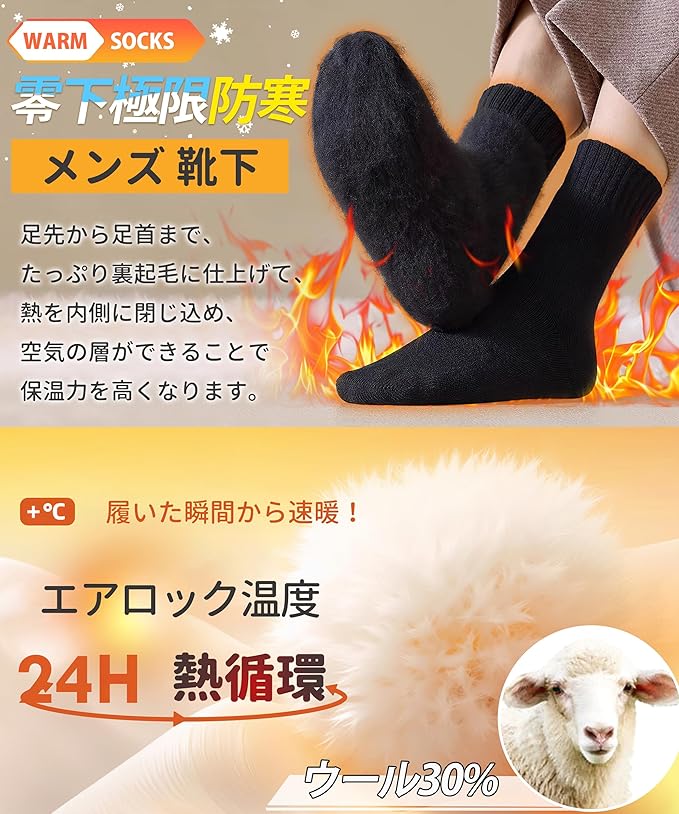 【秋冬専用極厚ウールソックス登場!】素材構成:ウール30%+コットン10%+ポリエステル45%+スパンデックス15%、サイズ: 25-29cm、 対象: 男女兼用。 季節: 春、秋、冬。洗濯:手洗い後、風通しの良い場所で干してください。裏地はウールでやわらかく非常に暖かい履き心地のルームソックスです。足先から足首まで、たっぷり裏起毛に仕上げて、熱を内側に閉じ込め、空気の層ができることで保温力を高くなります。この防寒ソックスは厚手で暖かく、柔らかい、伸縮性が高い、保温性に優れているため、屋外でも屋内でも使え、まるで暖炉に包まれているようだ!