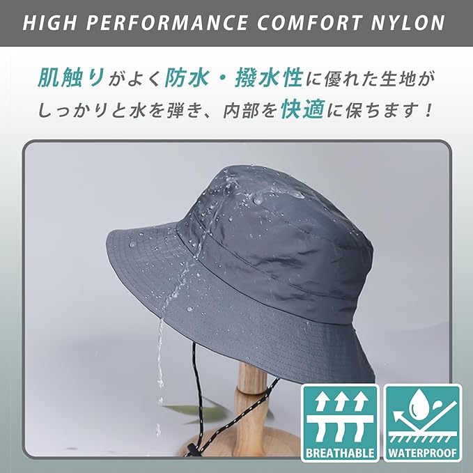 【サイズ・仕様】頭周りのサイズはアジャスターで調整可能(~最大約61cm程度)。ツバは約7.5cm、あご紐は最長約37cmで重さは約70グラムと超軽量。折りたたむと直径約16cmで薄さ約2cmに収まります。肌触りのよさと高い防水性を実現した高品質なナイロン製です。