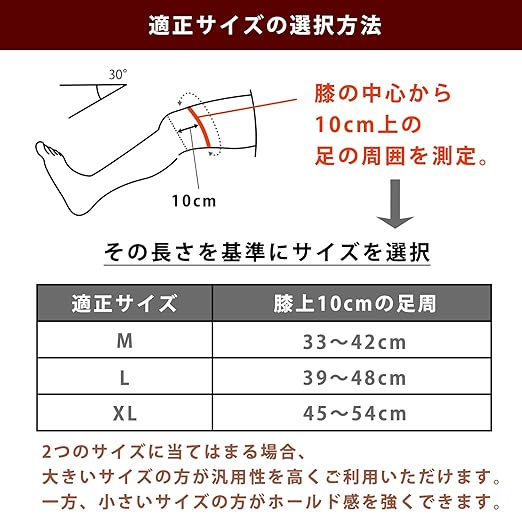 【適合サイズ】膝上10センチの周囲を測定してサイズをお選びください。Mサイズは膝上10センチの周囲が33〜42cm、Lサイズは膝上10センチの周囲が39〜48cm、XLサイズは膝上10センチの周囲が45〜54cmの方に適しています。(※2つのサイズに当てはまる場合、大きいサイズの方が汎用性を高くご利用いただけます。一方で、小さいサイズの方がホールド感を強くできます。※衣類の上から装着する場合には、衣類の上から足の周囲を測定してサイズを選定してください。)