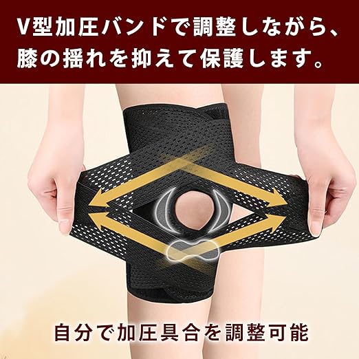 【商品概要】伸縮性のあるバンドで締めるタイプの膝サポーター(膝下のパッドが配置された改訂版)です。左右共通タイプで、バンドの加圧具合はご自身で調整可能。性別、年代を問わず、日常生活においてはもちろん、激しいサポーツをする際にもご使用いただけます。