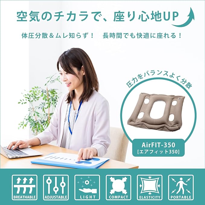 【 長時間の座りも快適!体圧分散エアクッション「AirFIT-350(エアフィット350)」】 空気が体圧を分散し、座り心地を快適にするエアクッションです。デスクワーク・ドライブ・旅行・オフィスなど、長時間座る場面でも活用可能!空気注入の調節で、好みの柔らかさ&厚さに変更可能。長時間座る方やデスクワークが多い方にもおすすめです。