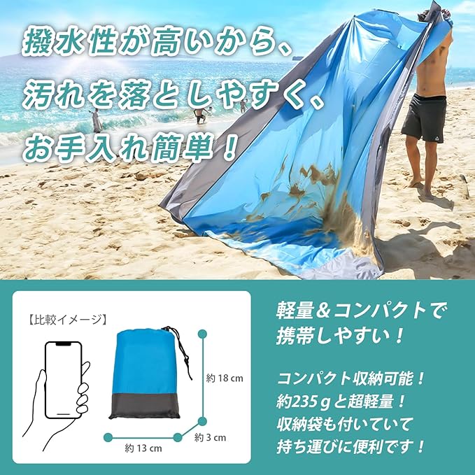 【商品概要】薄手ながら高品質な撥水・速乾生地を使用していて、超コンパクトに収納できる万能レジャーシートです。大人から子供まで幅広く利用できるデザインでオールシーズン使用でき、ピクニック、お花見、花火大会、遠足、キャンプ、野外フェス、海水浴、運動会、スポーツイベント、紅葉狩り、バーベキューなど、さまざまな場面で活躍します。また、防災用や避難用としても利用できます。