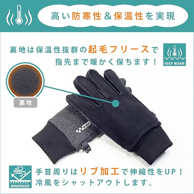 【幅広い用途に使える!】高い防寒性&保温性がありながら肌触りが良くて脱着しやすく、指先まで動かしやすくて撥水加工も施されているので、使い勝手がよく、幅広いシーンで気軽に使えます。ちょっとしたお出かけや通学などの普段使いはもちろん、自転車、サッカー、ハイキング、雪遊びなどの際にも◎。子供たちへのプレゼントにもオススメです。