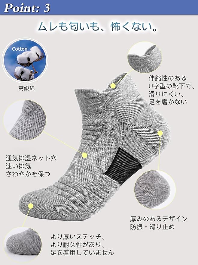 【肌触りと耐久性も抜群です】天然長日照コットンを採用した故、毛落ちや毛玉が発生しにくく、水洗いでも色落ちや収縮が発生せず、柔らかくて通気性も優れており。つま先、甲、かかとを全方向に補強します、足ズレを防止できるし、衝撃を受けた時足を守ることもできます。通気メッシュを加えて、熱気を発散させ、いつまでも快適のままにいられます。