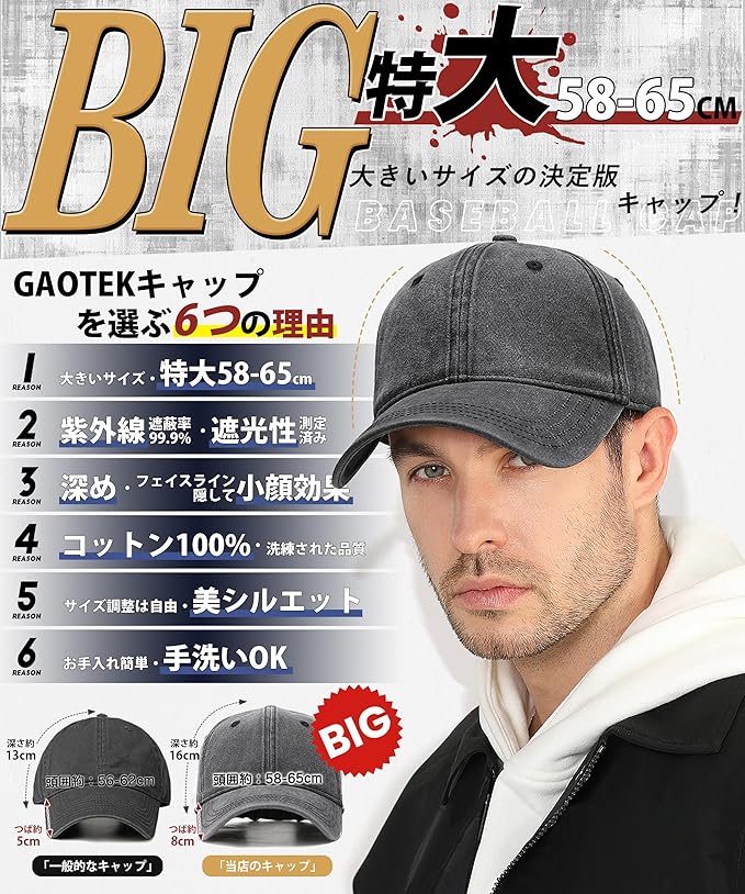 [GAOTEK] 特大58-65cm キャップ メンズ 大きいサイズ 帽子【UPF50+・遮光性測定済み・顔がしっかり隠れる】 野球帽 無地 コットン100% 深めタイプ 紫外線対策 UVカット 人気 男女兼用 | etshop
