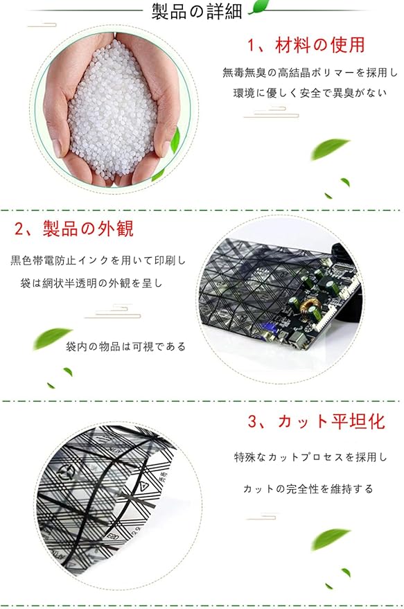 【材質】この帯電防止袋はポリエチレンテレフタレート(PET)から作られ、壊れにくく、無毒で異臭がなく、表面の金属化膜は良好な帯電防止効果があり、安心して使用することができる。