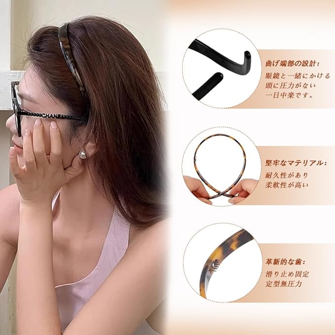 【メガネと重ならない曲線的なデザイン】このカチューシャをつけると、メガネもしっかりとかけられ、重ならず耳元を圧迫しにくい。そのため痛くなく、長時間着用することができます。