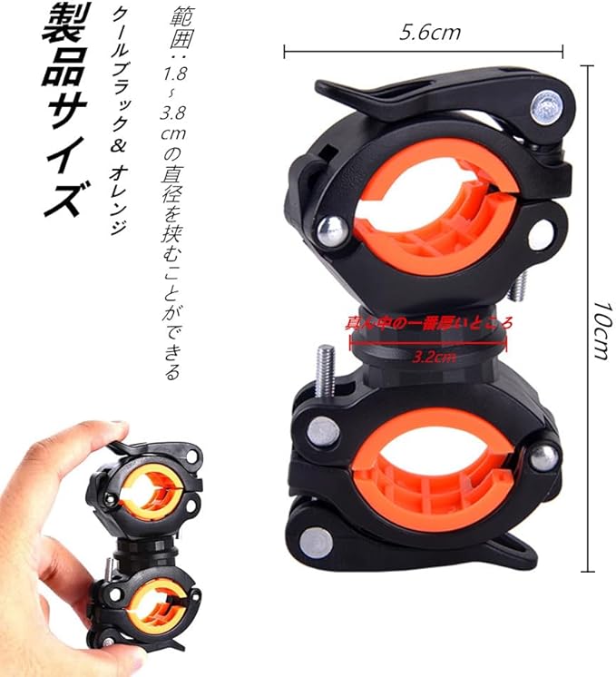 自転車 ライトホルダー 懐中電灯ホルダー 360度回転 サイズ調整可能 固定ブラケット 直径1.8cm-3.8cmライト対応 バイク ヘッドライトブラケット 円形懐中電灯専用 クランプホルダー 操作簡単(黑+橙色)
