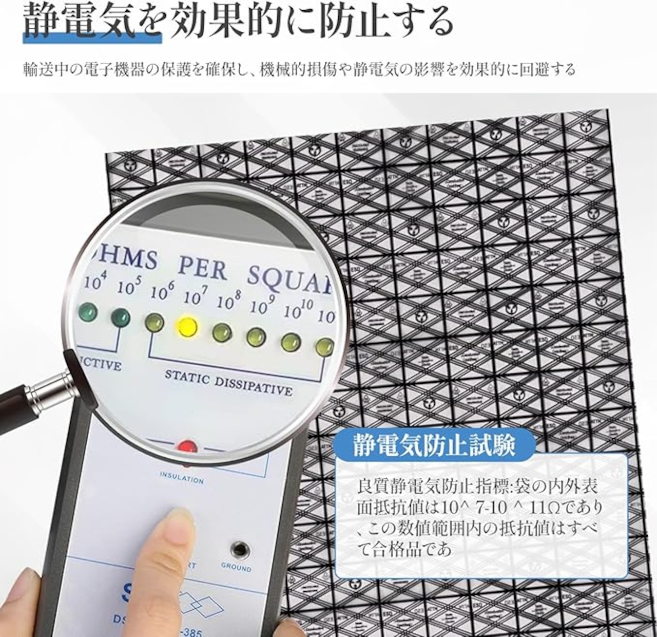【特殊素材の特徴】導電性PETを採用し、帯電防止効果が持続し、精密電子部品の長期保管に最適な環境を提供します。