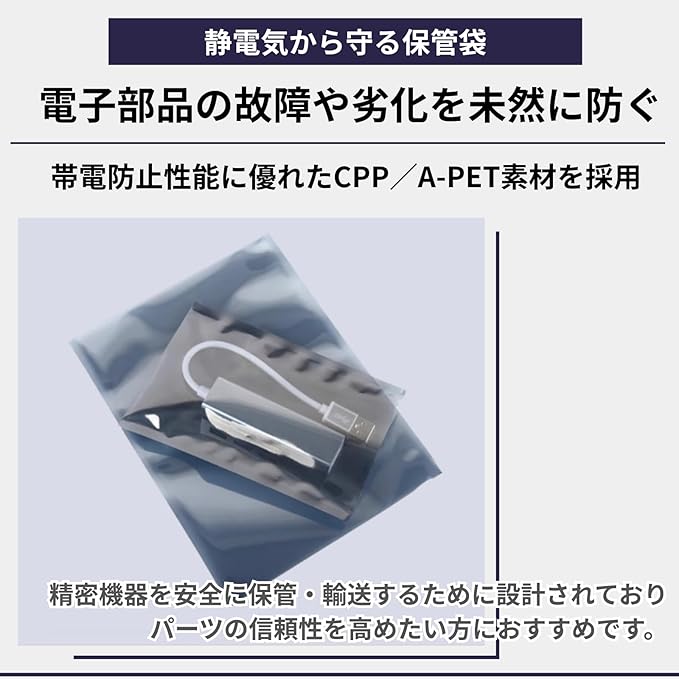 【静電気から守る保管袋】 帯電防止性能に優れたCPP/A-PET素材を採用し、静電気による電子部品の故障や劣化を未然に防ぐ静電気防止袋です。ICチップ、SSD、基板、メモリなどの精密機器を安全に保管・輸送するために設計されており、パーツの信頼性を高めたい方におすすめです。